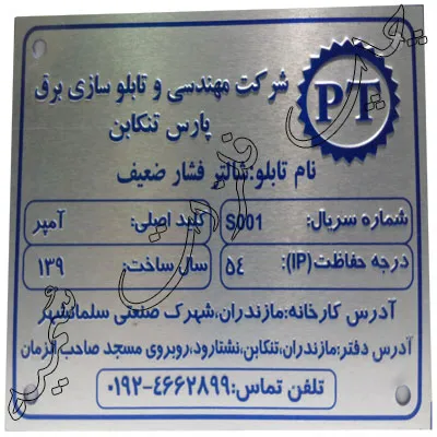 - هر تابلو باید شامل یک پلاک که در آن مشخصات تابلو ذکر شده است، باشد. از جنس مقاومی ساخته شده و در محل ثابتی نیز نصب شود. این پلاک باید شامل اطلاعات زیر باشد: