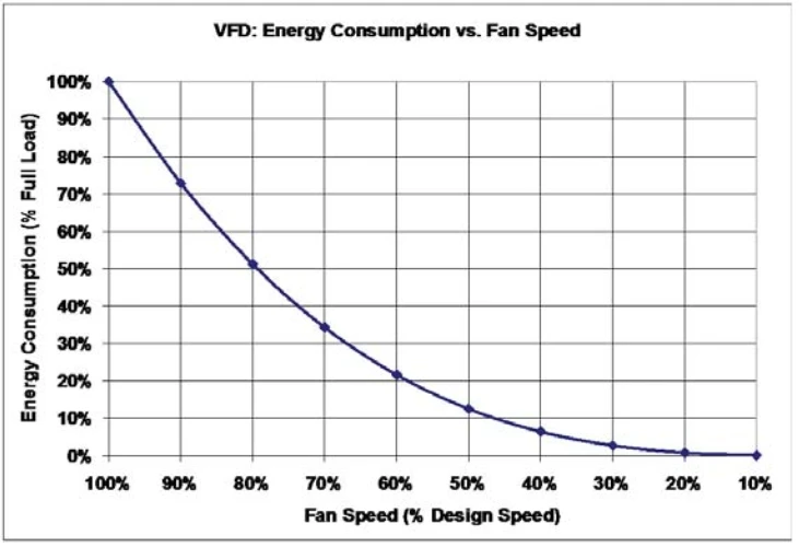 همانطور که در نمودار بالا مشاهده می شود، انرژی استفاده شده توسط فن با افزایش سرعت فن به صورت درجه 3 افزایش می یابد. در نتیجه اینورتر با کنترل و کاهش سرعت فن در دماهای پایین تر میزان مصرف انرژی را به طور قابل ملاحظه ای کاهش می دهد. این کاهش به گونه ای است که اگر سرعت فن تنها 20% کاهش پیدا کند، همانطور که مشاهده می شود میزان مصرف انرژی به میزان 50% کاهش می یابد که مقدار قابل ملاحظه ای است. در نتیجه با یک حساب سرانگشتی در می یابید که در بلند مدت، اینورتر می تواند صرفه جویی قابل توجهی در هزینه ها ایجاد کند.