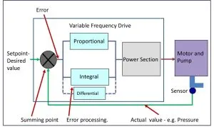 در یک کاربرد رایج از درایوها برای سیستم پمپاژ، نقطه مرجع (فشار مورد نظر) را می توان با استفاده از یک ورودی آنالوگ یا مقدار ثابت تنظیم کرد و مقدار واقعی نیز با یک ترنس دوسر فشار که که به دیگر ورودی آنالوگ درایو متصل می شود، تعیین می گردد. خطا سپس دائما سرعت موتور را تغییر می دهد. حال برای این که کنترل خوبی داشته باشیم و همچنین سیستم پایدار بماند، سیگنال خطا باید پردازش شود.