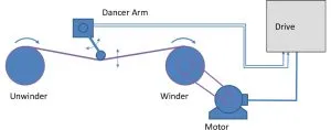 کنترل حلقه PID غالبا برای کاربردهایی همچون کنترل دما، فلو یا فشار مورد استفاده قرار می گیرد. اما کاربردهای بسیار دیگری نیز وجود دارند، مثل حفظ تنش در یک سیستم سیم پیچی یا رولینگ الیاف، که شکل زیر آن را نمایش می دهد. بازوی لغزنده یک پتانسیومتر را به حرکت در می آورد و پتانسیومتر نیز سیگنال را به درایو ارسال می کند. بدین ترتیب درایو میزان تنش روی ماده در حال پیچش را بدست می آورد. بدین شکل درایو می تواند سرعت خود را به گونه ای تنظیم کند که تنش روی ماده یا الیاف ثابت باقی بماند.
